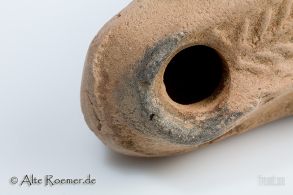 Vollständig erhalten. Rötliche Farbreste teilweise auf Oberfläche. Leichte Sandpatina. An der Dochtöffnung Rußspuren.