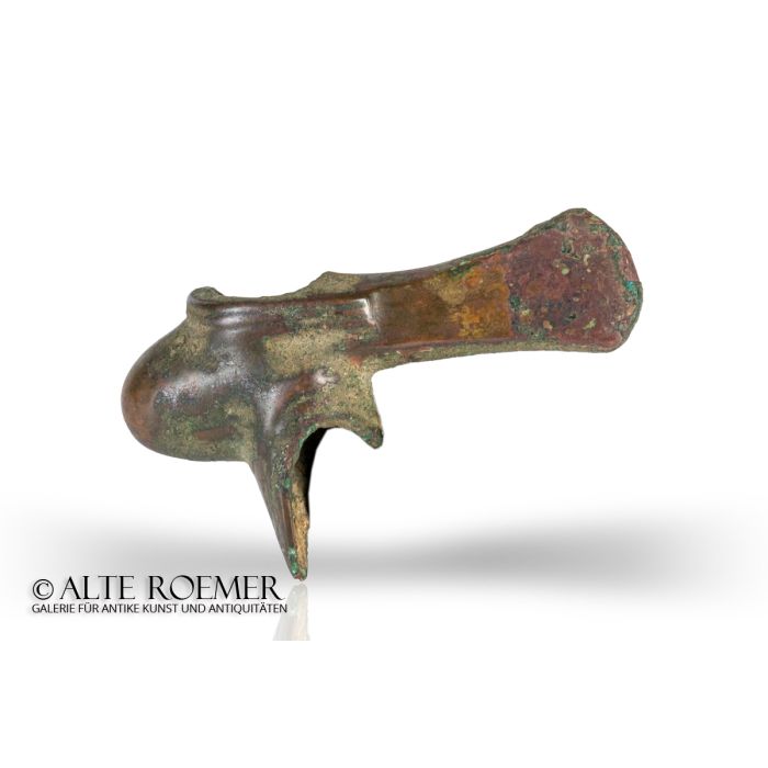 Eleganter Axtkopf aus Luristan. Lange Klinge mit halbmondförmiger Schneide, der Nacken ist abgerundet. Das Schaftloch befindet sich nahe dem Nacken. Es wird oben von einem Rand gesäumt und geht unten in einen angeschnittenen Zylinder über. Die Grundform kann als Weiterentwicklung eines Axttyps aus dem altakkadischen Reich gesehen werden. Die Form des Schaftlochs ermöglichte einen stabilen Sitz des Axtkopfs auf dem Schaft. Wobei die tatsächliche Verwendung als Arbeitsgerät fraglich ist, eine rein rituelle Funktion ist genauso denkbar. |