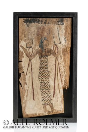 Egyptian painted panel with goddess ImentetThe painting was once on the inside of a sarcophagus lid, as a welcome to the underworld. The piece is published in an exhibition catalogue from 1972. From the 25th or 26th dynasty of Ancient Egypt.